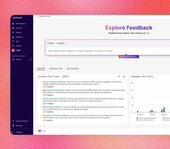Product teams move fast, but impact isn't just about shipping, it's about adoption. With Pendo, you can know with certainty what users love, where they struggle, and what they ignore. Guide them to value with in-app help. Watch behavior change and iterate.