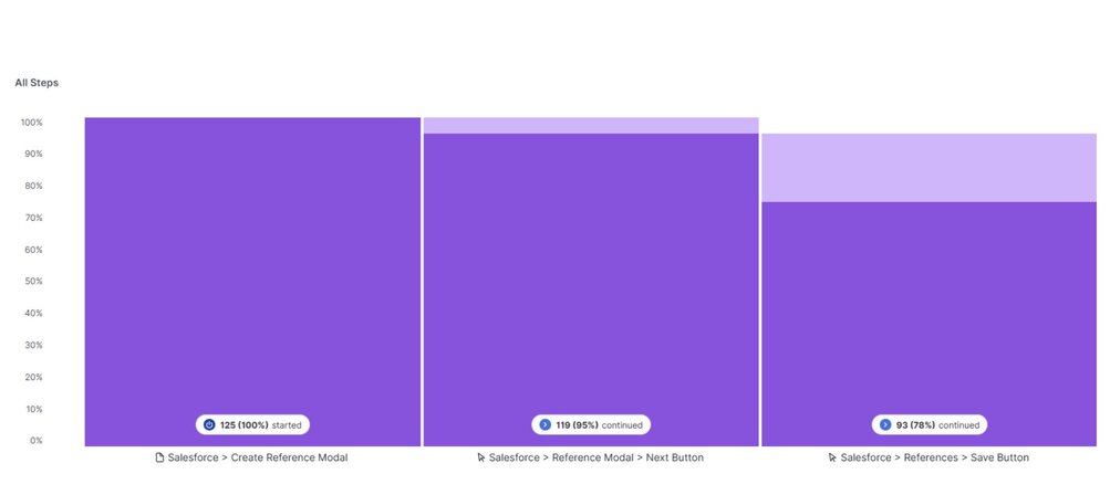 “In Salesforce, you can’t see what happens after reps create an opportunity. With Pendo, we could map out workflows and see what employees were actually doing,” Dewell explained. Dewell’s team uncovered points of friction in workflows, including a major drop off in a key workflow.