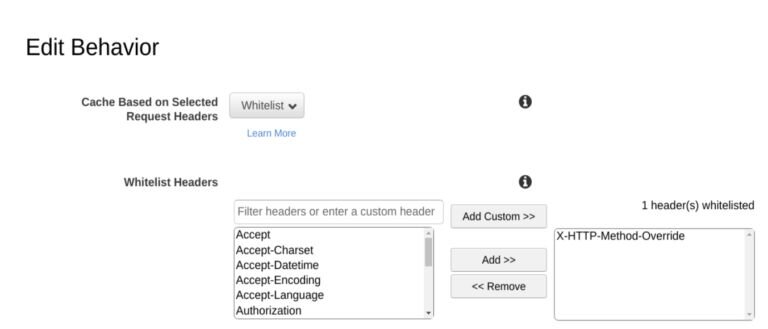 However, while testing this, we explored another option which allowed us to entirely ignore the header for the purposes of caching. We used the AWS “whitelist” feature to include the X-HTTP-Method-Override header in the basis for identifying cached data. With that in place, the 0-length content returned for X-HTTP-Method-Override: HEAD is not used to answer a normal request, defeating the cache poisoning attack. This is the better solution for our case, primarily because it does not incur any additional latency, but also because it is entirely free of additional cost. We used the following steps to “whitelist” the header: