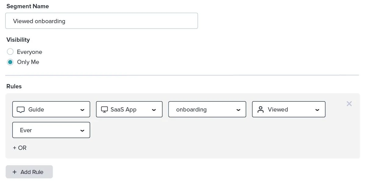 Prior to analyzing specific metrics, you should first create a user segment filtering users who have viewed the particular onboarding guide you’re looking to measure.