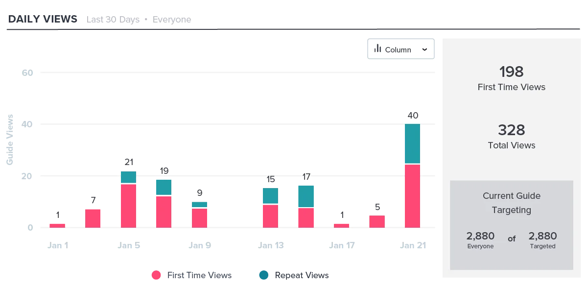 You can first see an overview of how many people viewed the guide versus how many people were targeted with the guide. This report can easily visualize whether a particular guide achieved the reach you anticipated.