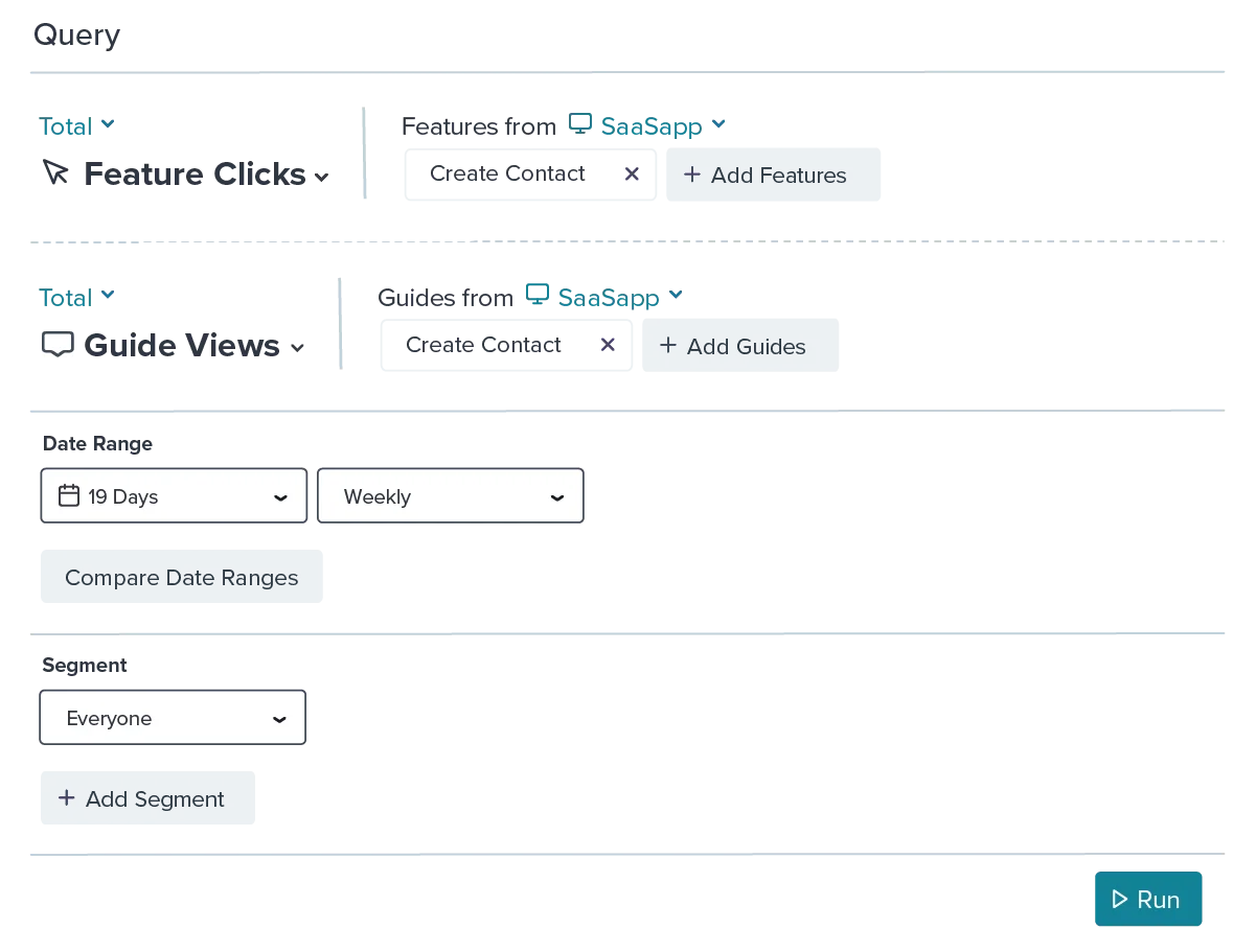 You can easily run a query to see how a guide influenced usage of a particular feature. Do this by selecting the appropriate feature and guide in data explorer and apply the date range you’d like to analyze.