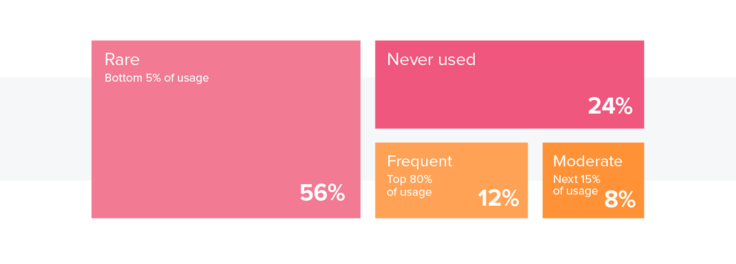 To see how feature usage maps to the 80/20 rule, we organized the data into four categories: frequent, moderate, rare, and never used.