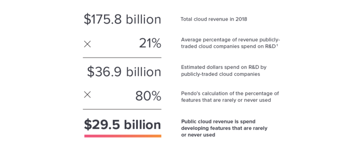 Based on an aggregation of anonymized product usage data, Pendo determined that 80 percent of features in the average software product are rarely or never used. Publicly-traded cloud software companies collectively invested up to $29.5 billion developing these features, dollars that could have been spent on higher value features and unrealized customer value.