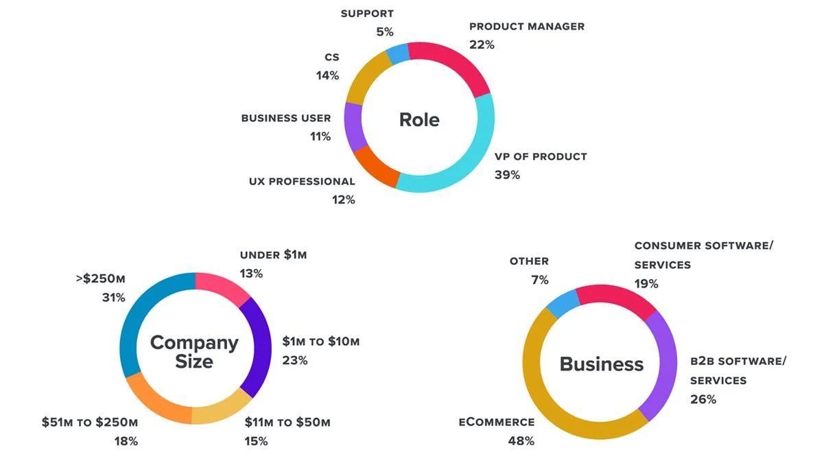 The majority of respondents were in either a product manager or executive role– 58% with a smaller representation of other roles. Businesses were split between commercial software and eCommerce, and company size varied from very small, early stage companies to large enterprises.