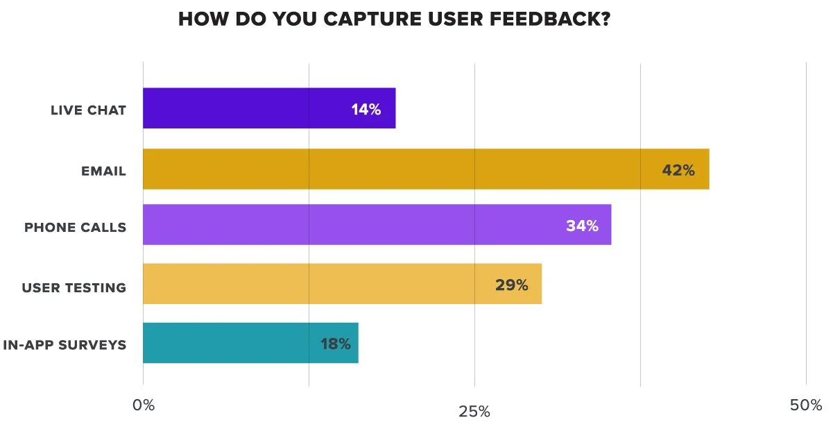 Email was the most used method, followed by phone outreach. Only a small number users reported using in-app surveys or live chat to interact with users. This is another opportunity that companies can seize. Collecting feedback in-app can deliver a 2x-4x higher response rate when compared to email, and because it engages customers when they’re specifically using the app, it often provides much more relevant and detailed feedback.
