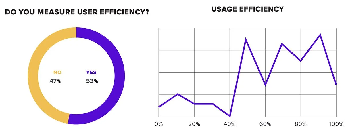Again, only about half of the respondents reported that they currently track this metric. Those that did averaged about 60% usage of their key features. We saw a smaller percentage of users reporting that they measure user efficiency. However, of those that do, the average efficiency rate was higher—by nearly 70%. These companies are likely heavily focused on the user experience and as a result are driving strong results in this area.
