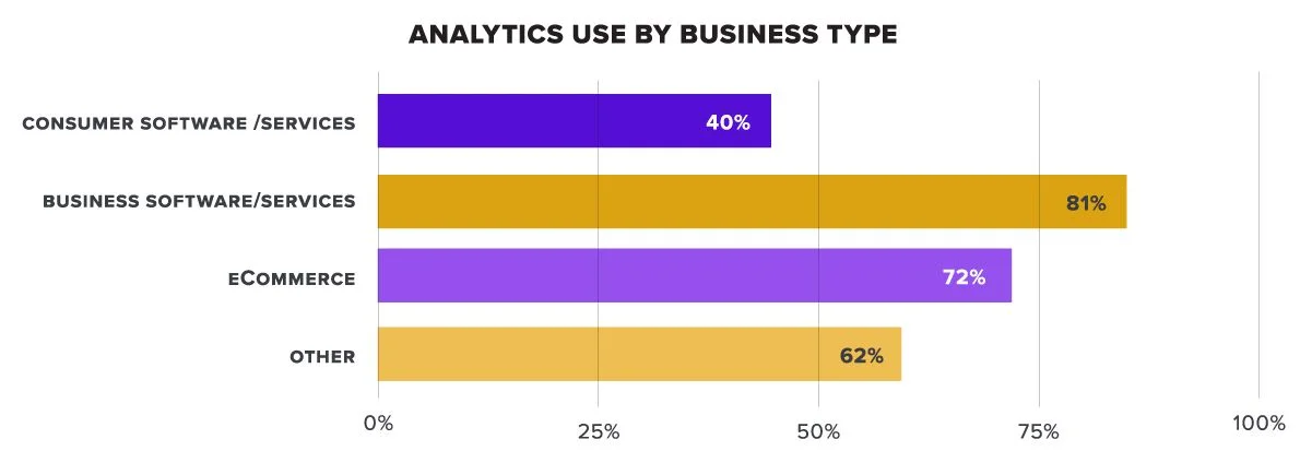Over 80% of B2B software companies and 70% of eCommerce companies reported some level of product analytics, while consumer software companies lagged far behind at 40%. Consumer products companies likely have access to detailed market and customer research through other channels which may be taking the place of analytics within the product.