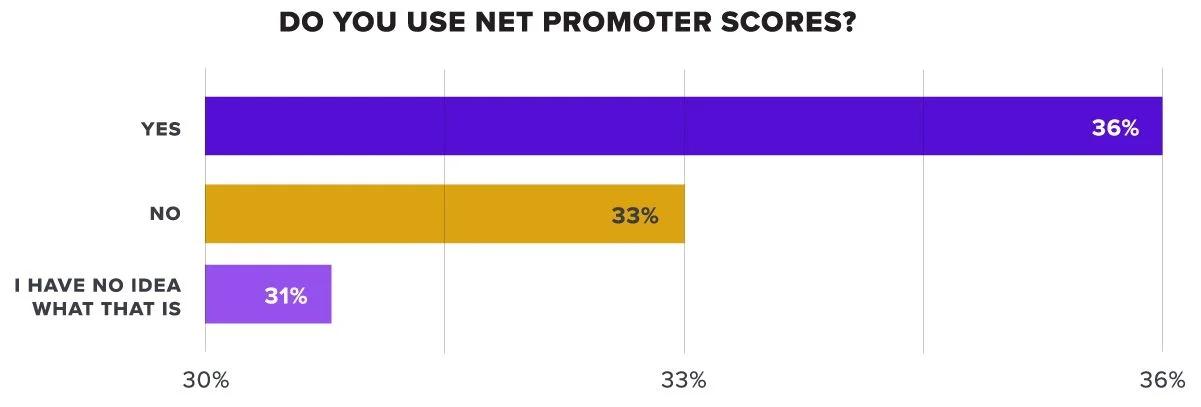 Unsurprisingly, nearly 90% of respondents reported collecting user feedback, and many reported collecting it quite frequently. We also asked whether they used Net Promoter Score (NPS) to benchmark customer satisfaction. Created in 2003 by Bain & Company, NPS is a popular methodology that provides a simple, numerical score of customer satisfaction which is also directly linked to growth potential.