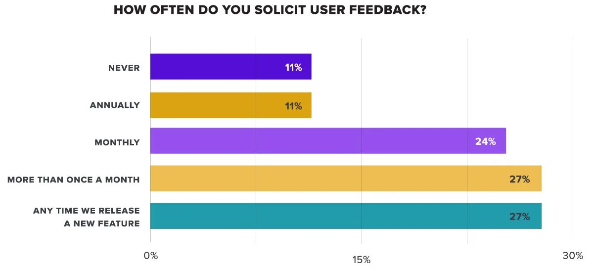 Another key source of product data is, of course, direct feedback from users. User feedback and user/usability testing is a common practice, but product teams may not necessarily consider it part of their analytic programs. User feedback plays a significant contextual role when trying to interpret observed user behavior. Quantitative analytics show what a user is doing in the application, but the feedback component provides the “why.” The most sophisticated product analytics programs regularly bring these two sources of data together for a more complete picture of both their users and the success of their products. Knowing this, we asked respondents how often they solicit user feedback (if at all).