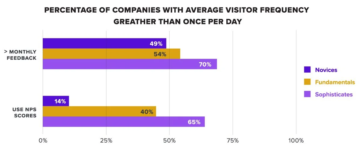 Look for opportunities to capture more user feedback. The best companies were much more rigorous in the frequency of feedback that they sought. Getting more feedback might not necessarily entail developing a new program. Support tickets, and UX tests are two sources of qualitative feedback that your company is likely collecting today. Begin by mining these to look for areas where customers experience pain.
