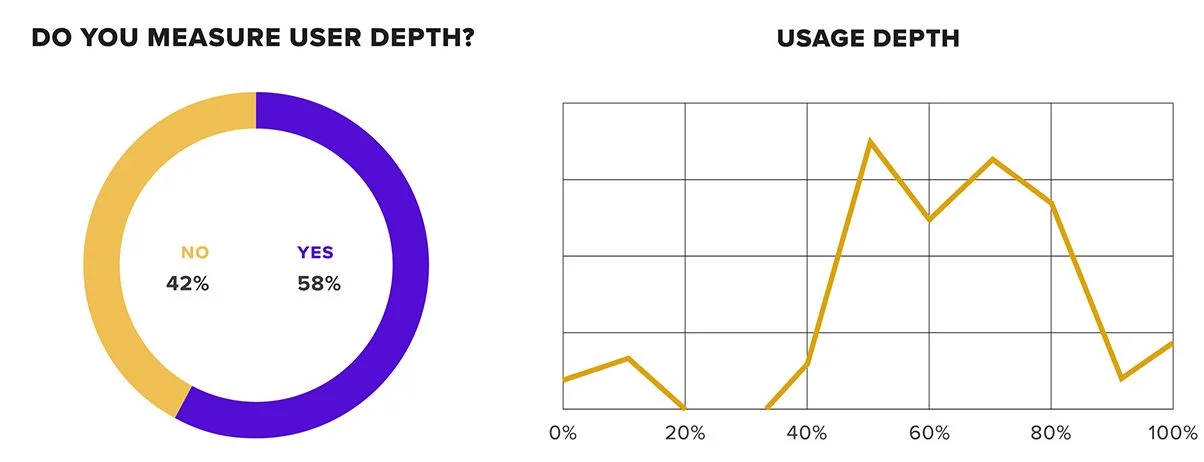 Only about half of the respondents reported that they currently use this practice, but another 24% recognized the importance of maintaining this feature list. The second part of the depth measurement looks at what percentage of the key features are regularly used in the application.