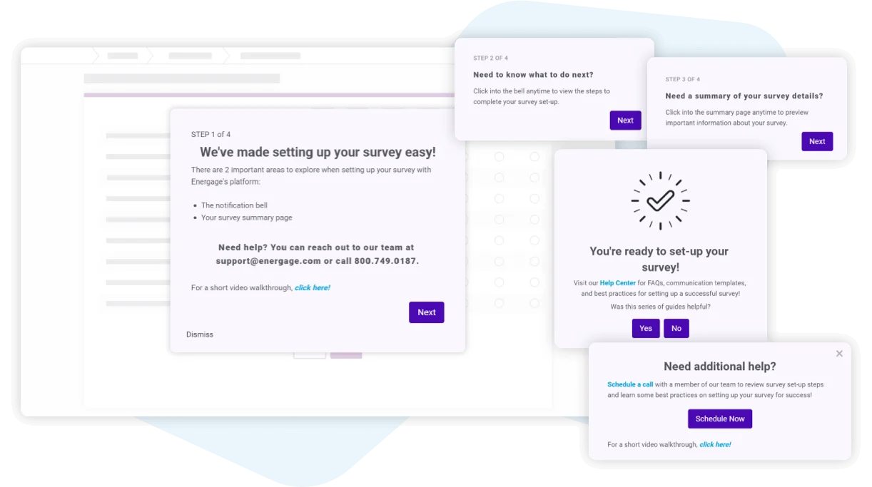 Energage created a four-step onboarding walkthrough for the set-up portion of their employee engagement survey, and segmented to only show the guide to the appropriate customer base. The team also created a fifth guide that appears for users who dismiss the guide in step one and after they answer “Yes” or “No” to “Was this series of guides helpful?” in step four. This final guide gives customers the option to schedule a call with a member of the Energage team if they need additional help.