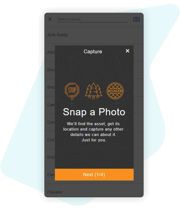 The product team at Cartegraph set out to onboard users onto Cartegraph Capture, a feature in their Cartegraph One mobile app that allows users to collect an infrastructure asset in the field by simply taking a picture. In order to drive repeat adoption of this feature, they created a four-step guide that shows users how to take a photo that will generate a high likelihood of success.