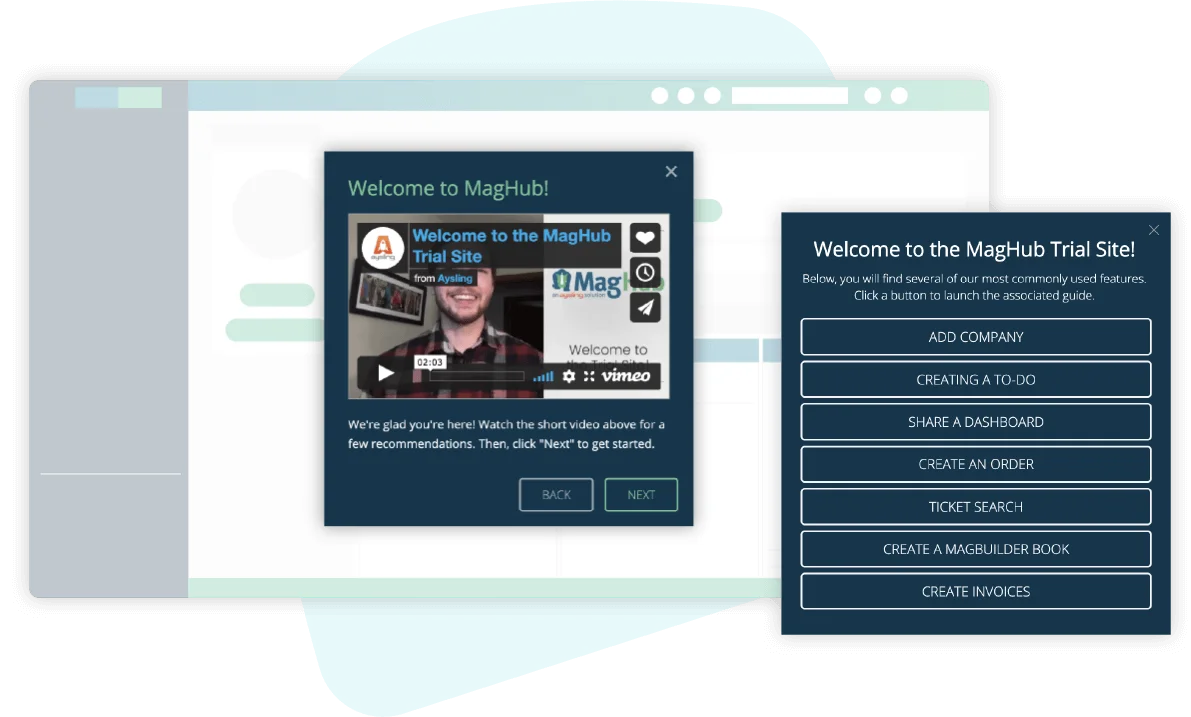 In an effort to personalize (and streamline) their free trial experience, the team at Aysling launched an in-app guide on their MagHub product’s trial site specifically for prospects logging in for the first time. It included a short welcome video to help orient users, and from there they could select a specific feature to learn more about.